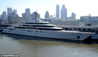 Apparently this is a very rare sighting (if you're not another billionaire who parks his yacht next to this one in, say, the French Riviera). But the rumor mill says that Mr. Abramovich's girlfriend is 8 months pregnant and will give birth in NYC.